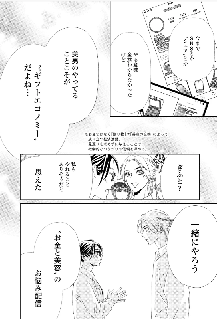 私自身、美容やお金の運用の話が好きなんです。すごく詳しいわけではないけれど、周りの人とそういった話をしていると「それ漫画に描いてよ」ってよく言われていて。ただ編集者さんとは「お金の話ってあんまりウケないんだよね」とも話していたんです。そんな中、美容のプロでチャラチャラした男性と、お金のプロで堅い女性――その2人のコンビの絵が見えてきて、これだったら漫画になるかもしれないと感じました。